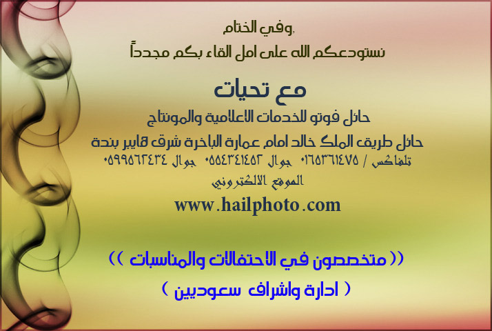 حائل فوتو الاعلامية تبارك للعريس وفقهم الله ( بارك الله لهم وبارك عليهم وجمع بينهم في خير ) وتنقل لكم جانب مصور من الحفل وبنتظار المرئيات على اليوتيوب قريبا ان شاء الله .
